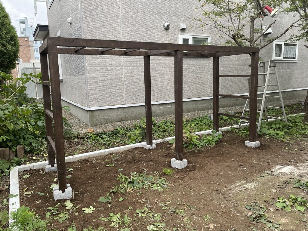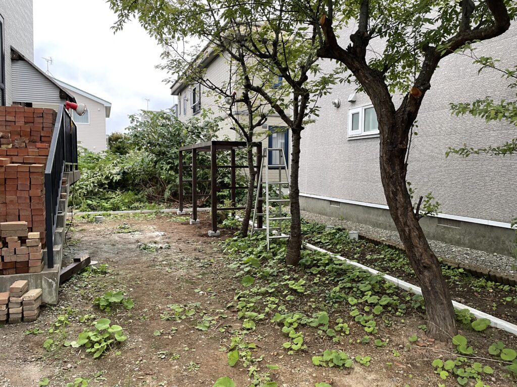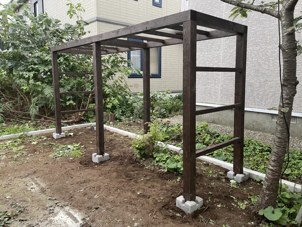 お庭スペースは伐採・伐根中にブドウと思わしき樹種を発見したので、急遽ブドウ棚を作成することにしました。
