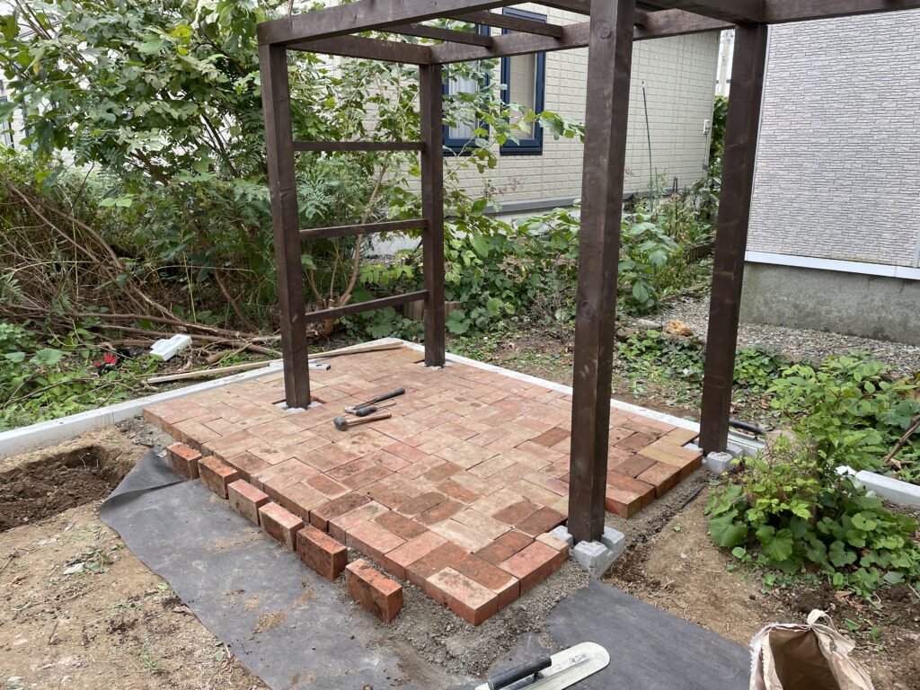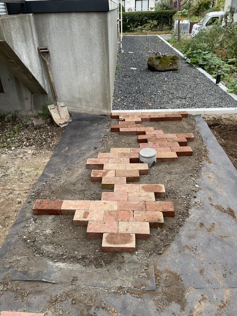 軽く整地して防草シートを敷き、セメントと砂をなんとなーく混ぜてレンガを好きなように並べました。