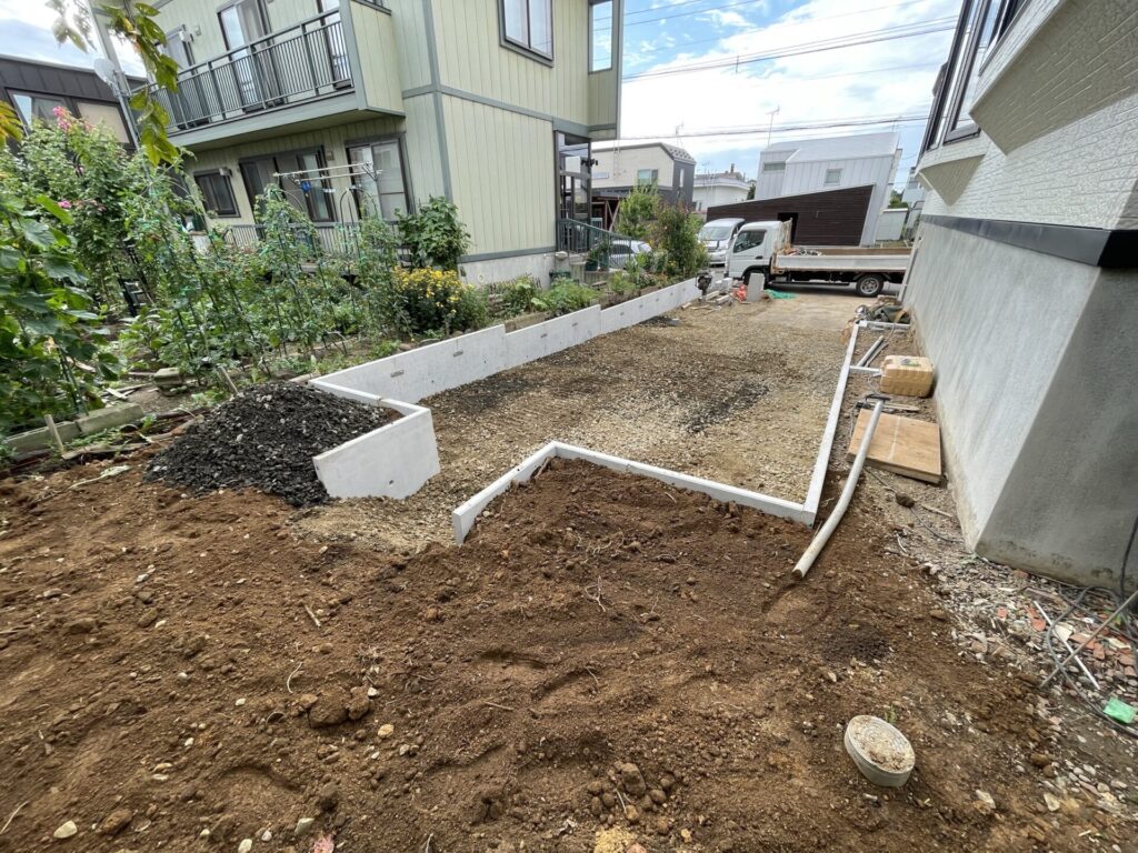 今回のL型ブロック土留めの施工は駐車スペースを最大限に広くとる為に、本来の使い方とは逆向きに付けています。